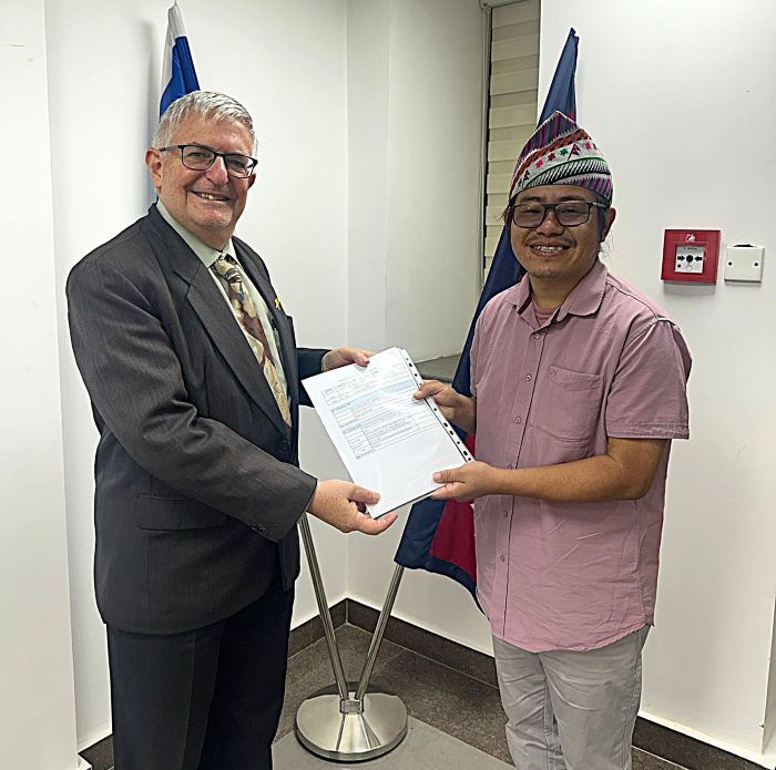 Israeli Ambassador Shmulik Arie Bass handing over docuements to Team Leader for Biomedical Engineering Research and Innovation at the National Innovation Center (NIC), Kirtipur, Kathmandu Umesh Jung Rai. Israel Embassy Photo